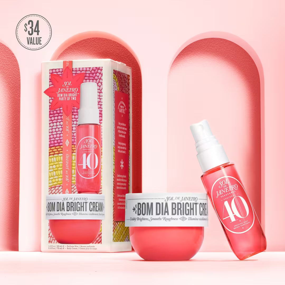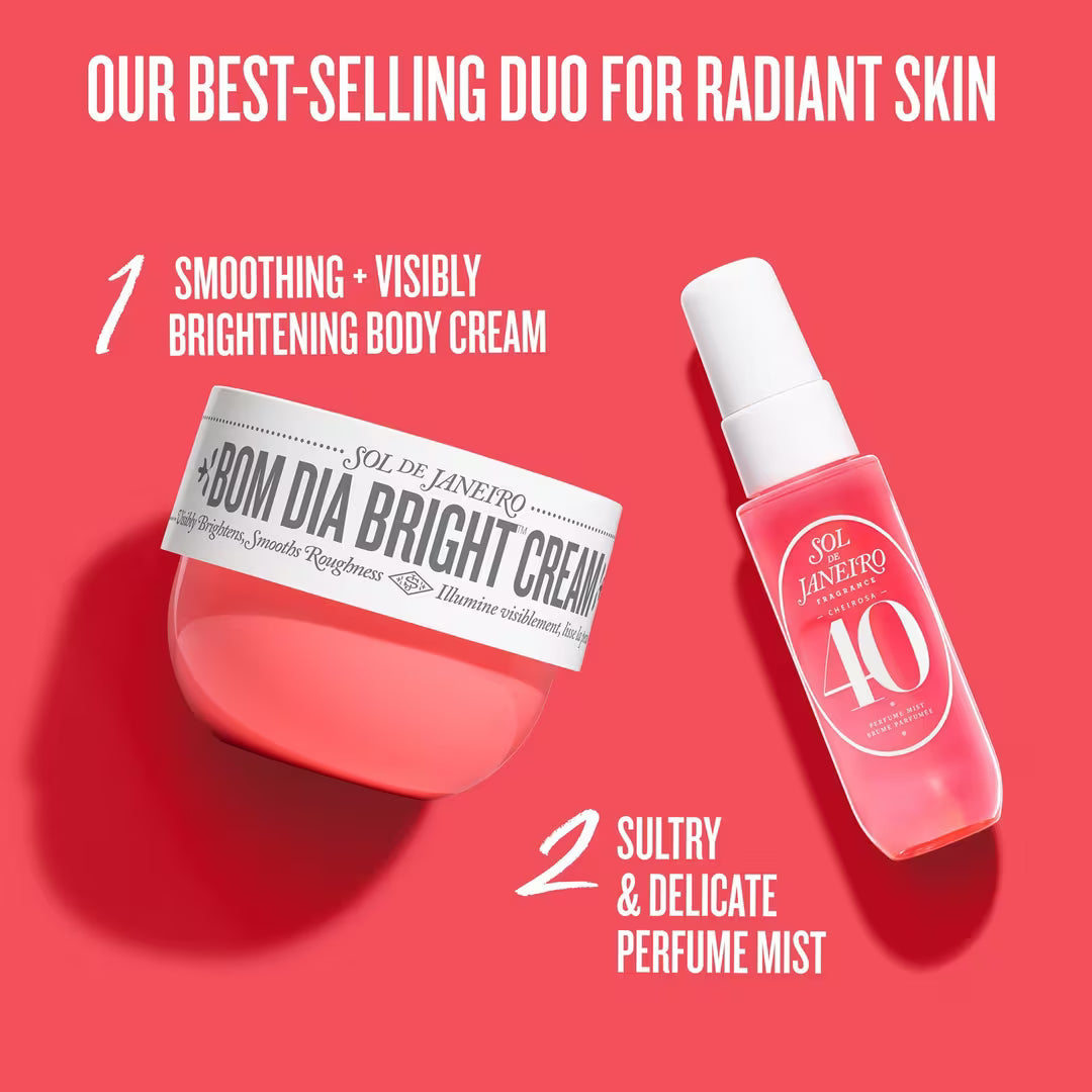 - ¡Hola, resplandor! Este dúo de edición limitada, ideal para viajes, incluye la crema corporal Bom Dia Bright™, suavizante y visiblemente iluminadora, y la seductora bruma perfumada Cheirosa 40, con notas de ciruela, ámbar negro y maderas de vainilla.