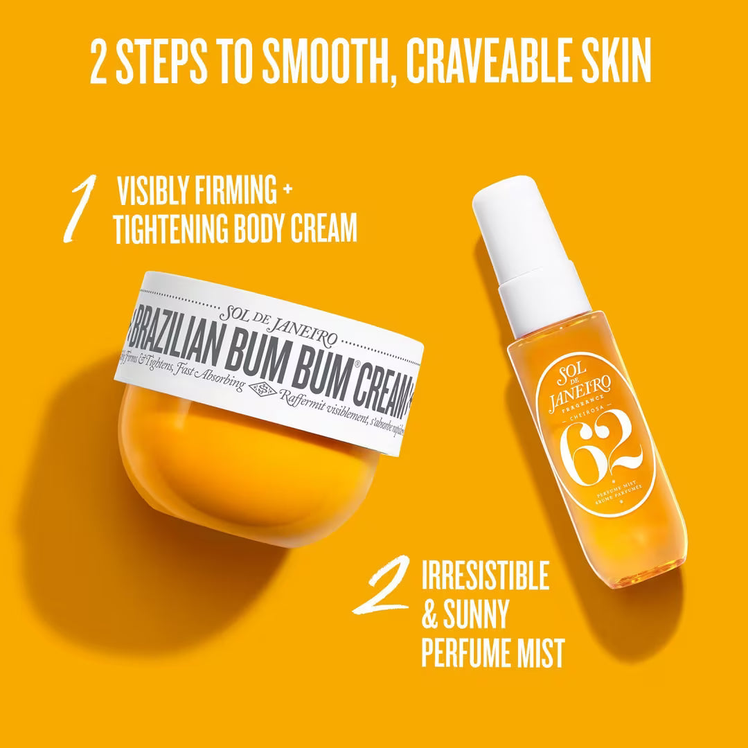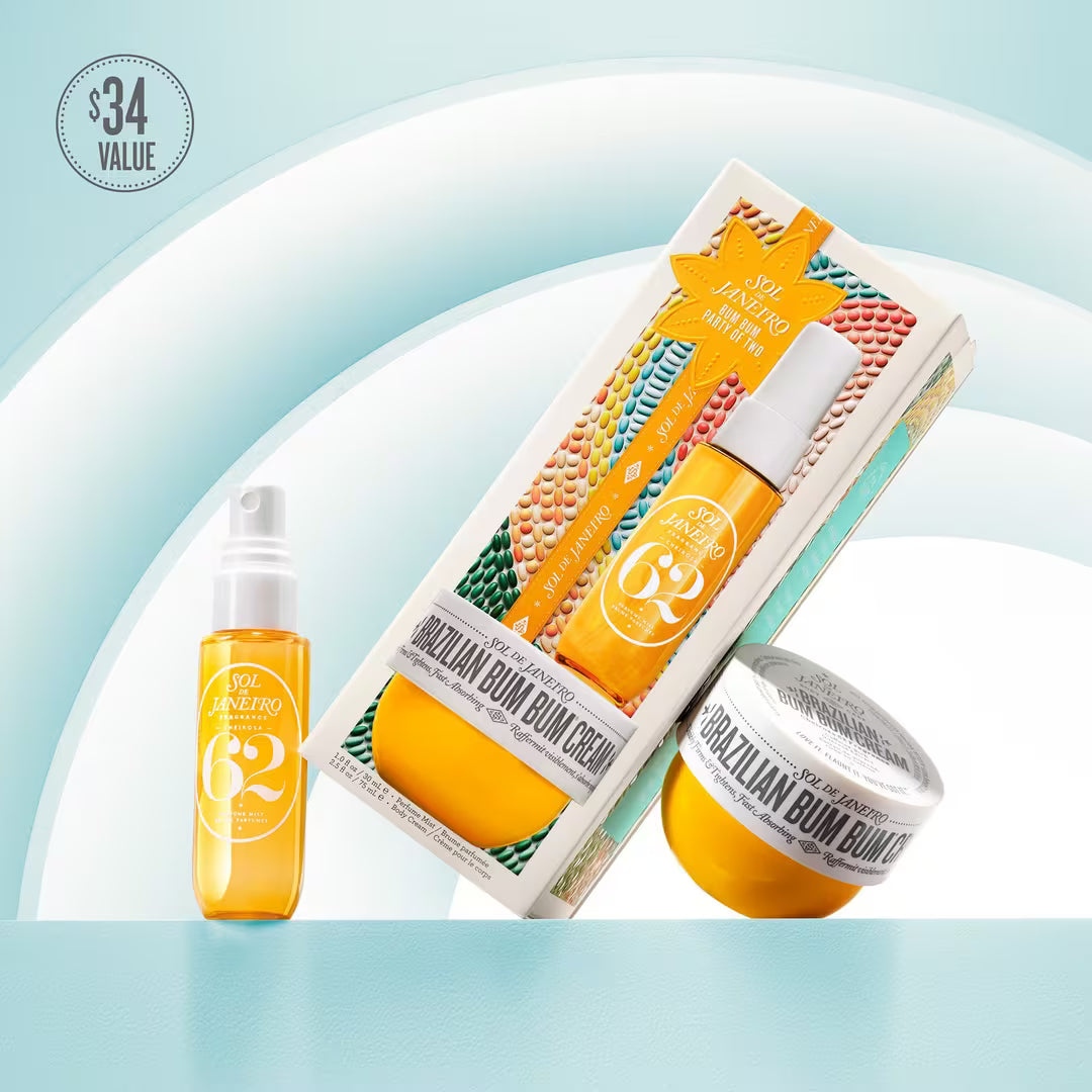 Bum Bum Party of Two de Sol de Janeiro duplica la icónica crema brasileña Bum Bum® y el irresistible perfume en bruma Cheirosa 62™ en este set que incluye deliciosos tamaños de viaje.