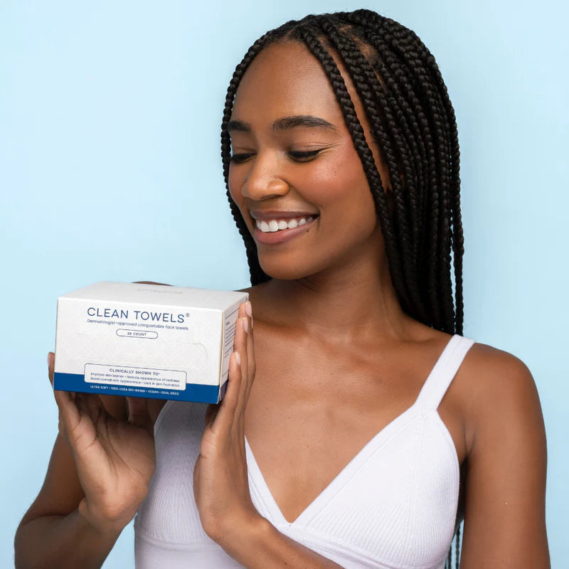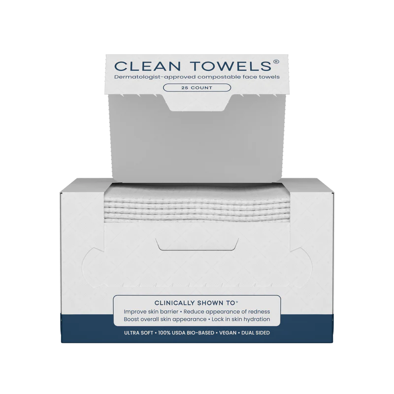 ¿Quieres ver una mejora en la salud general de tu piel? Deja de usar tu toalla o toallita habitual y usa las toallas faciales desechables Clean Towels. 25 toallas faciales desechables aprobadas por dermatólogos. Clínicamente comprobado que mejoran la barrera cutánea*.
