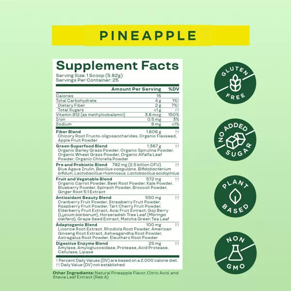 Greens tiene más de mil millones de visualizaciones en TikTok por su capacidad para aliviar la hinchazón y facilitar la digestión de la forma más deliciosa. Elaborado con más de 30 ingredientes, incluyendo frutas y verduras, fibra, probióticos y más, ¡este favorito de internet es imprescindible!