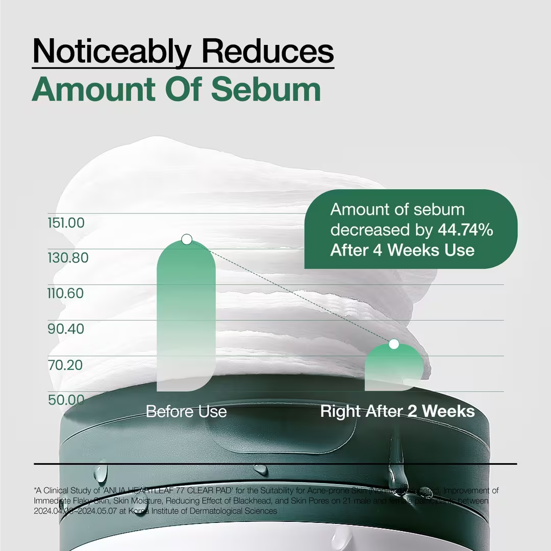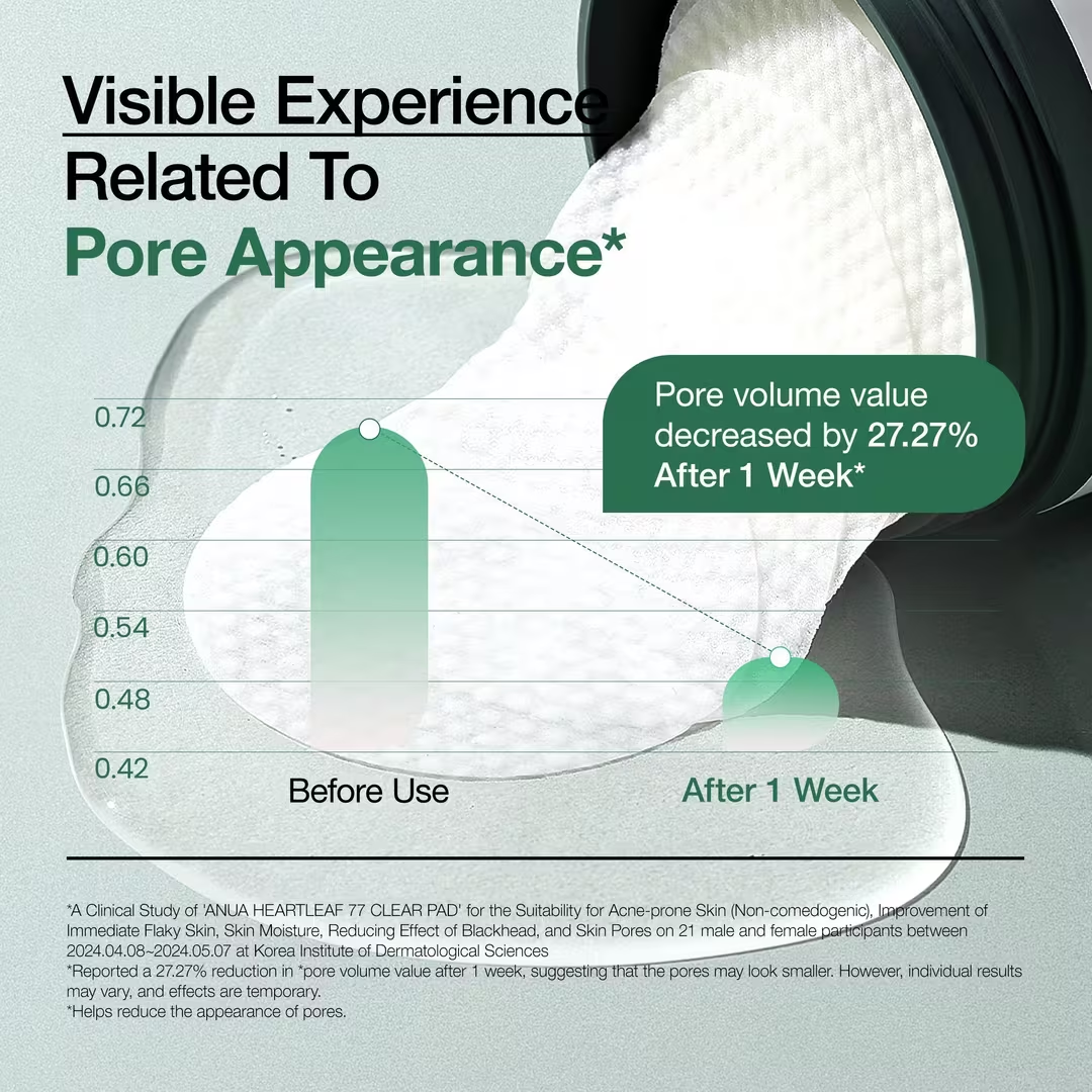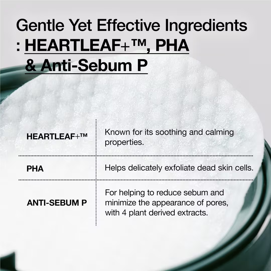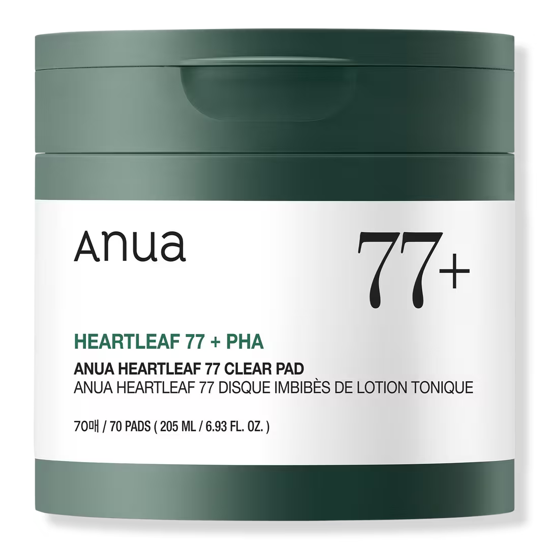 Anua Heartleaf 77 Clear Pad, almohadillas tónicas para exfoliar, están enriquecidas con PHA para exfoliar delicadamente las células muertas de la piel y reducir el exceso de sebo.
