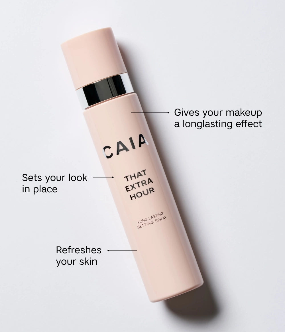 Protege tu maquillaje para noches interminables o largas jornadas de trabajo. That Extra Hour es un spray fijador de larga duración que prepara, fija y refresca el maquillaje de forma ligera. Su bruma, con textura de nube, deja una capa invisible de satén sobre la piel para una sensación revitalizante e hidratante de larga duración. Para aprovechar al máximo sus beneficios, rocíalo sobre todo el rostro antes y después del maquillaje.